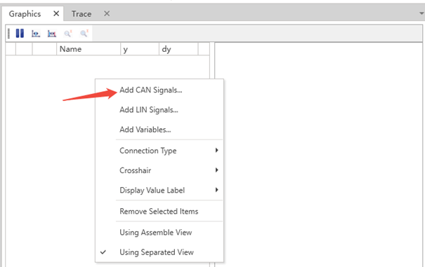 Select Datalnsights→Diagram in the ETStudio menu bar to bring up the Diagram window, right-click on the left side of the pop-up window and select Add Can Signals, and select the can signal you want to observe. By checking the box, determine how many CAN signals need to be displayed at the same time.