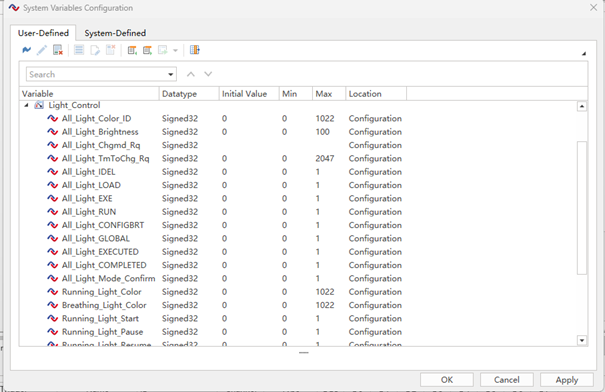 Here when we first understand the LIN signal for the interior light bar setting in the LDF database, it can be seen that there are several different models of IDEL/LOAD/EXE/RUN/GLOBAL/CONFIGBRT, and the dynamic effect of flow lamps and breathing lights can be realized through interaction.