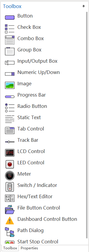 The Toolbox window displays all currently available controls, which can be dragged by holding down the left mouse button or double-clicking on the currently edited Dashboard.