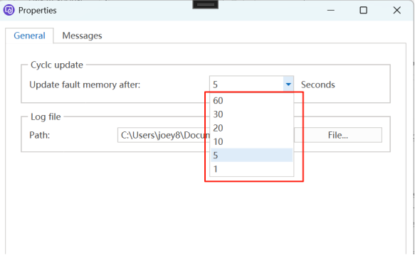 Update fault memory interval: Default: 5 seconds. Configure the recurring update interval.