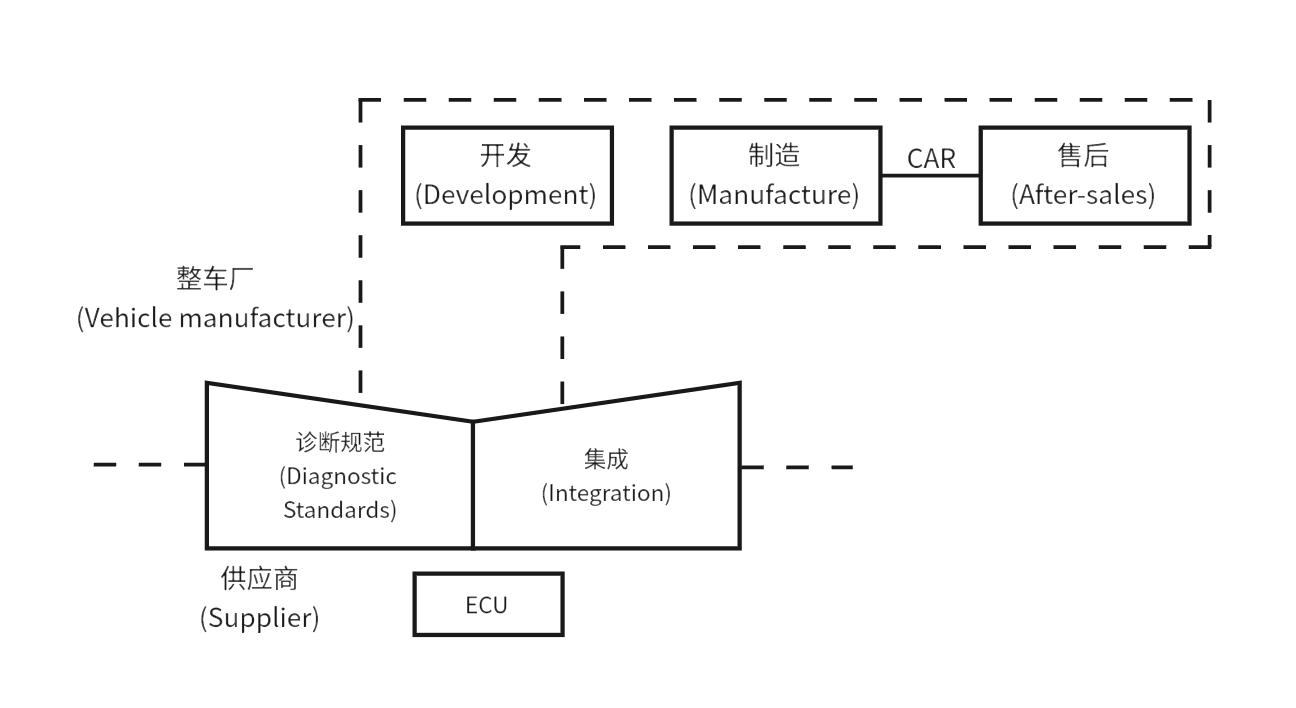 Diagnostics runs through the entire life cycle of the vehicle from development to after-sales, as shown in Figure. In the vehicle development phase, automakers and ECU suppliers jointly define and develop diagnostic functions.
