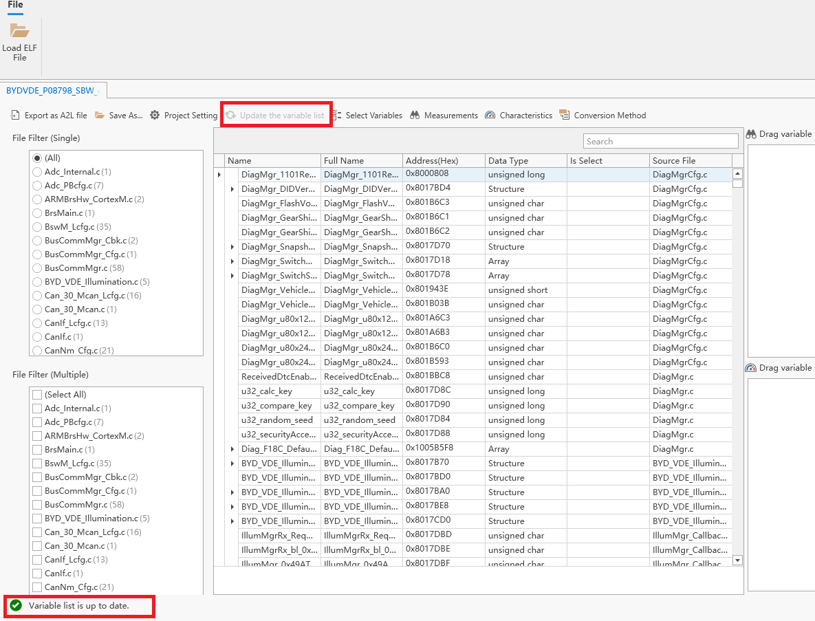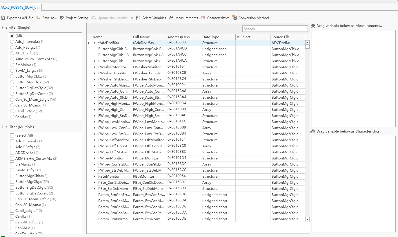 步骤 2:点击需要添加的变量/结构体/数组,右键菜单或拖拽到右侧即可将变量添加到观测/标定列表中。